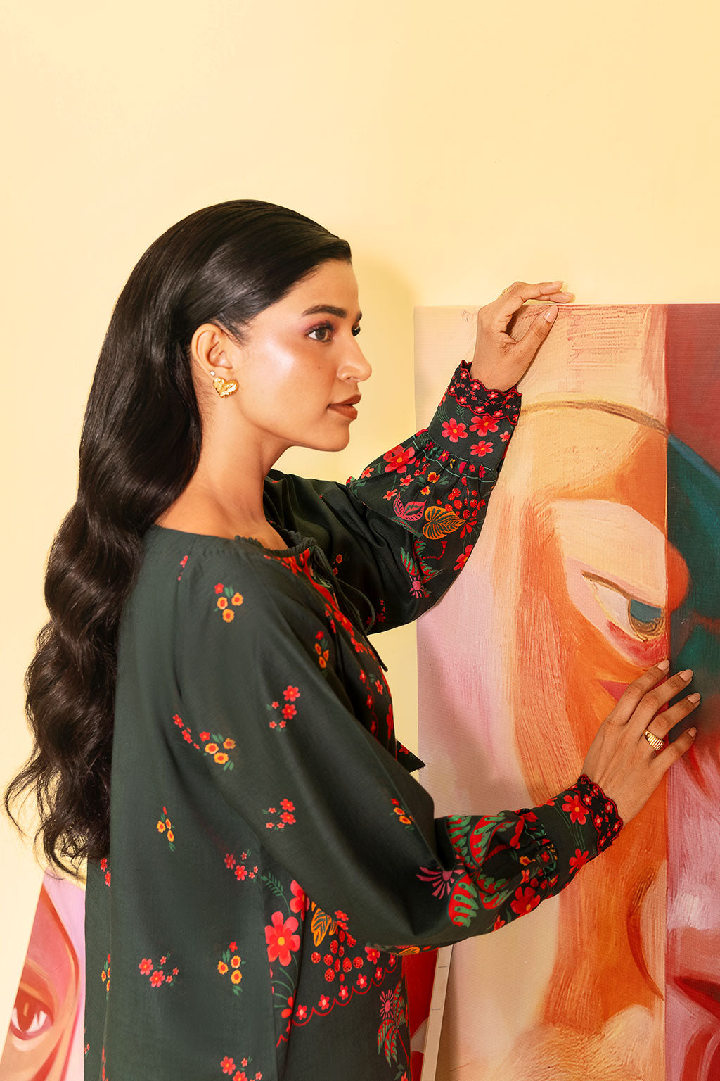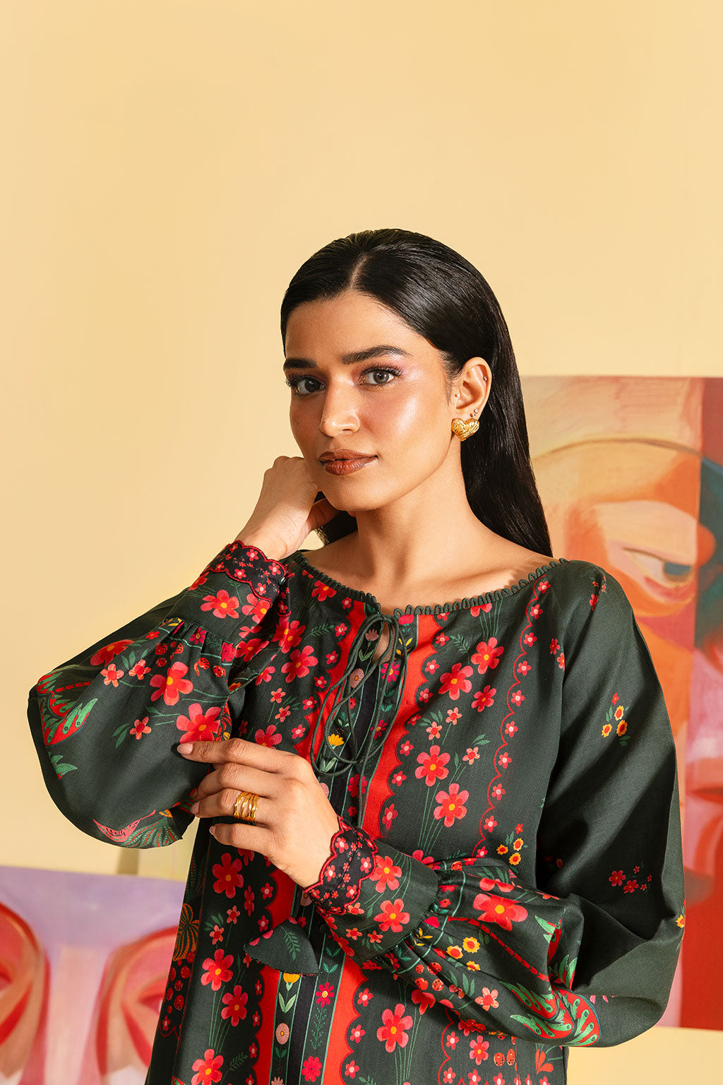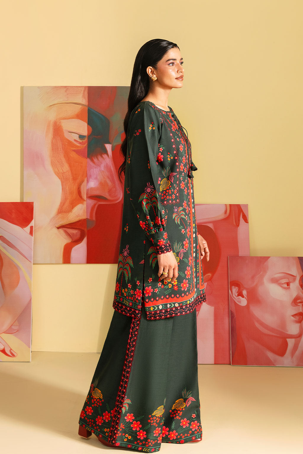 A Green Co-ord set adorned with bright floral prints, blending elegance with ease.