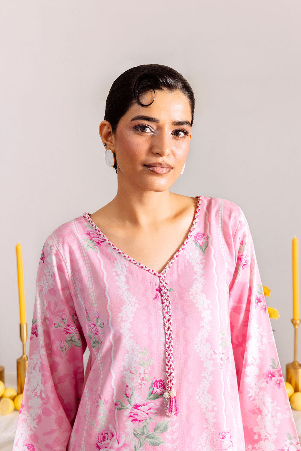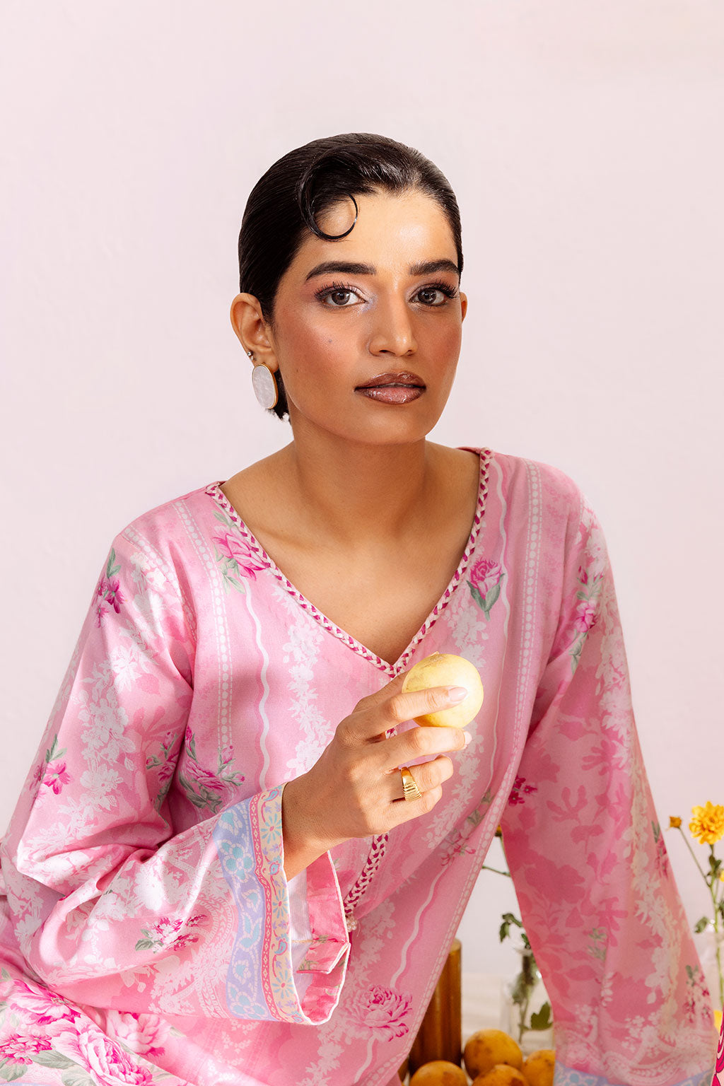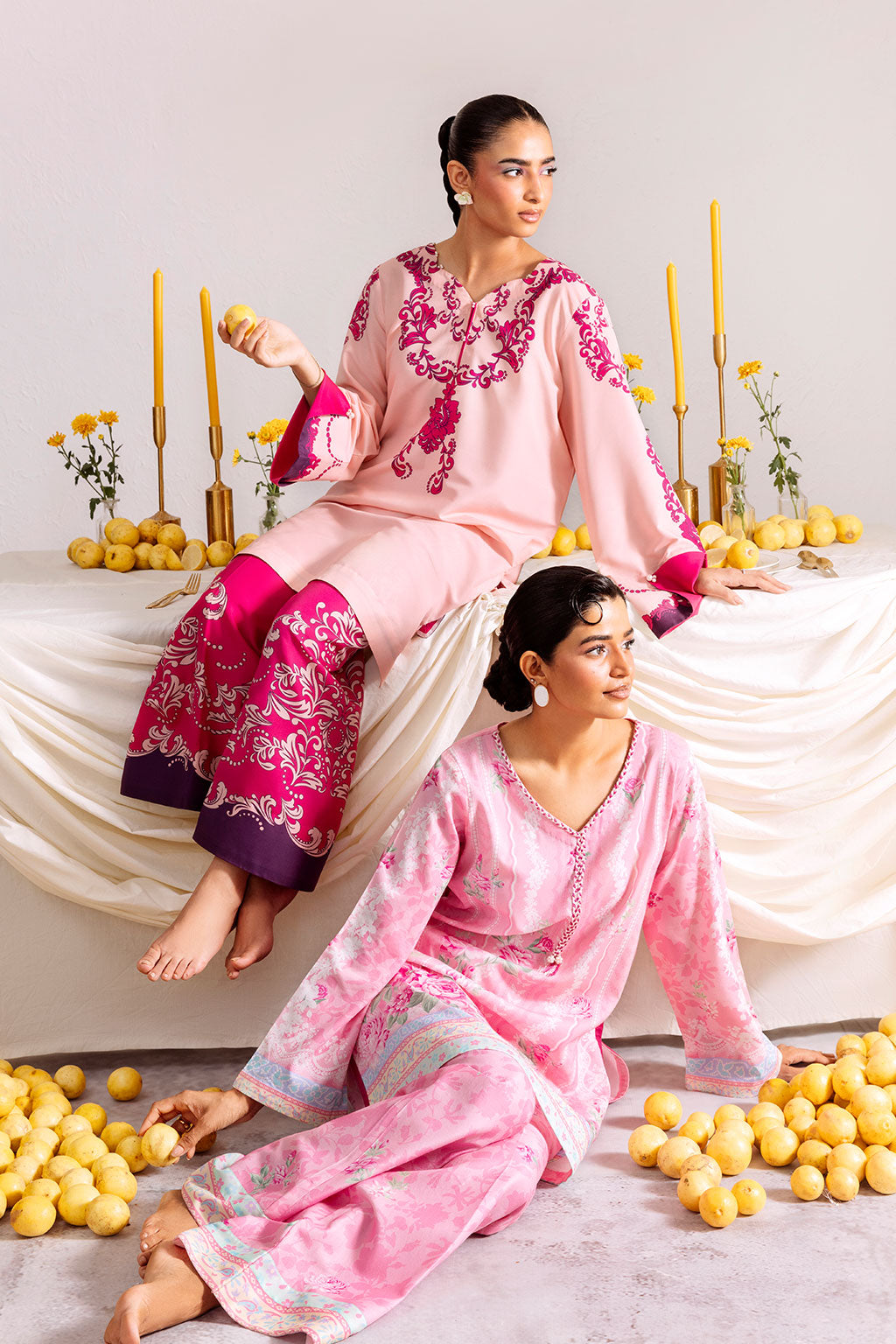 Soft pink Co-ord printed ensemble adorned with delicate floral patterns and pastel blue borders for a refreshing, feminine look.