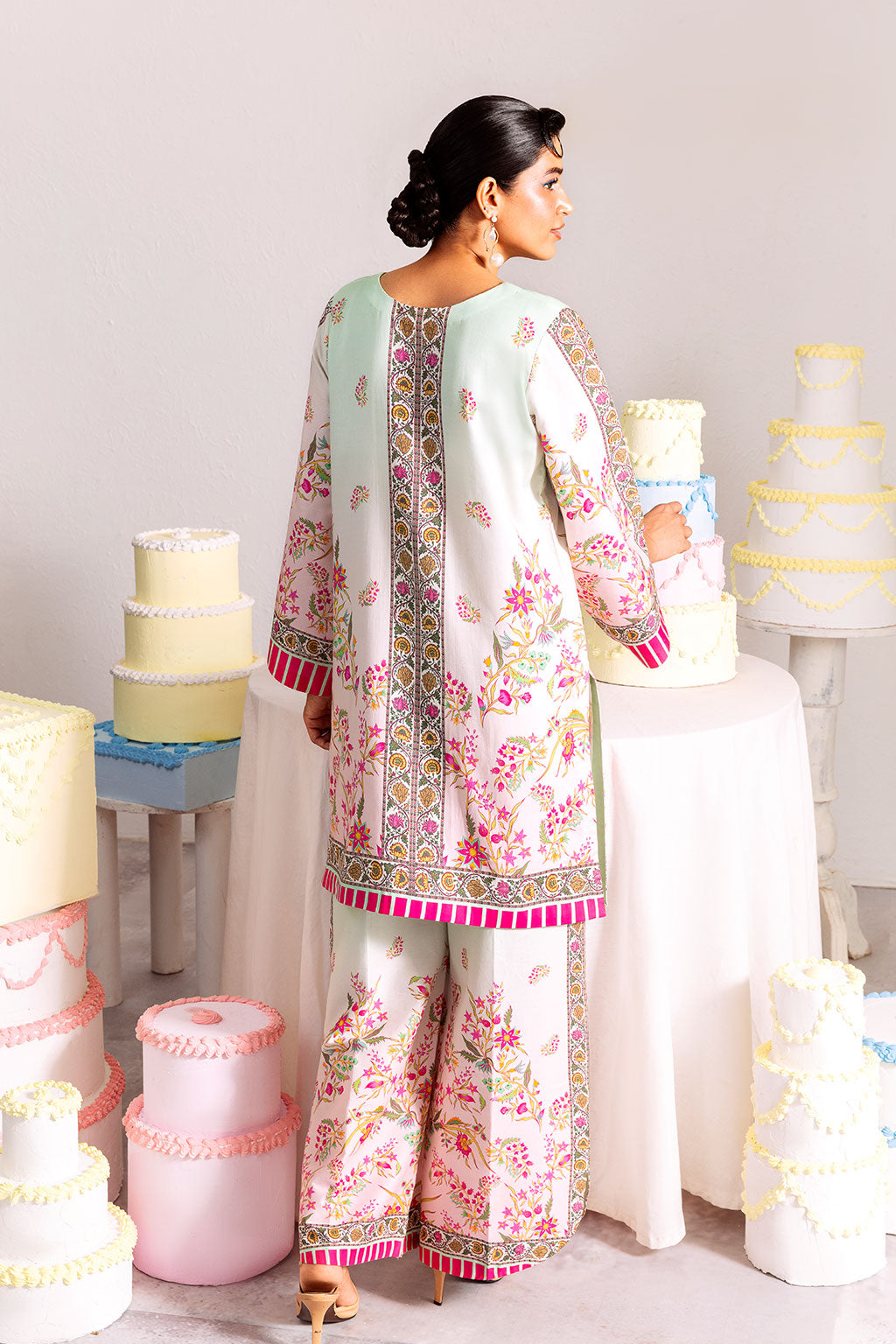 Pastel-hued printed co-ord adorned with vibrant delicate floral motifs and intricate border