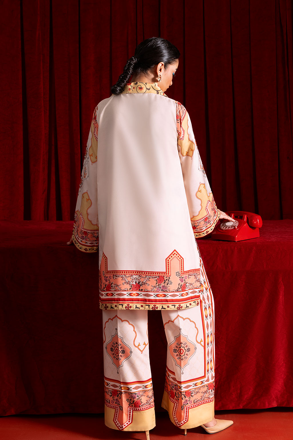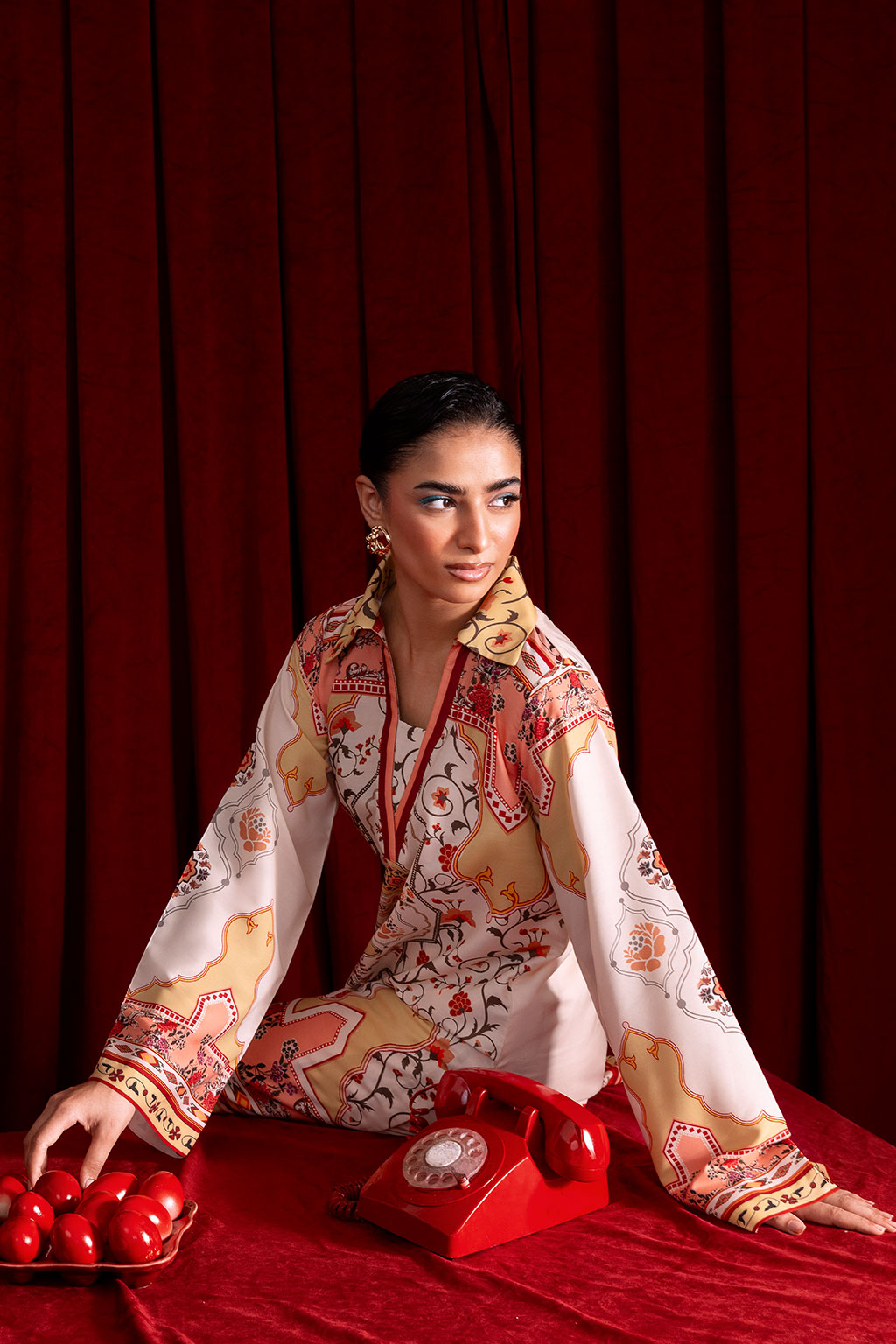 A blush pink Co-ord set adorned with bright floral prints, Features a shirt with neckline and