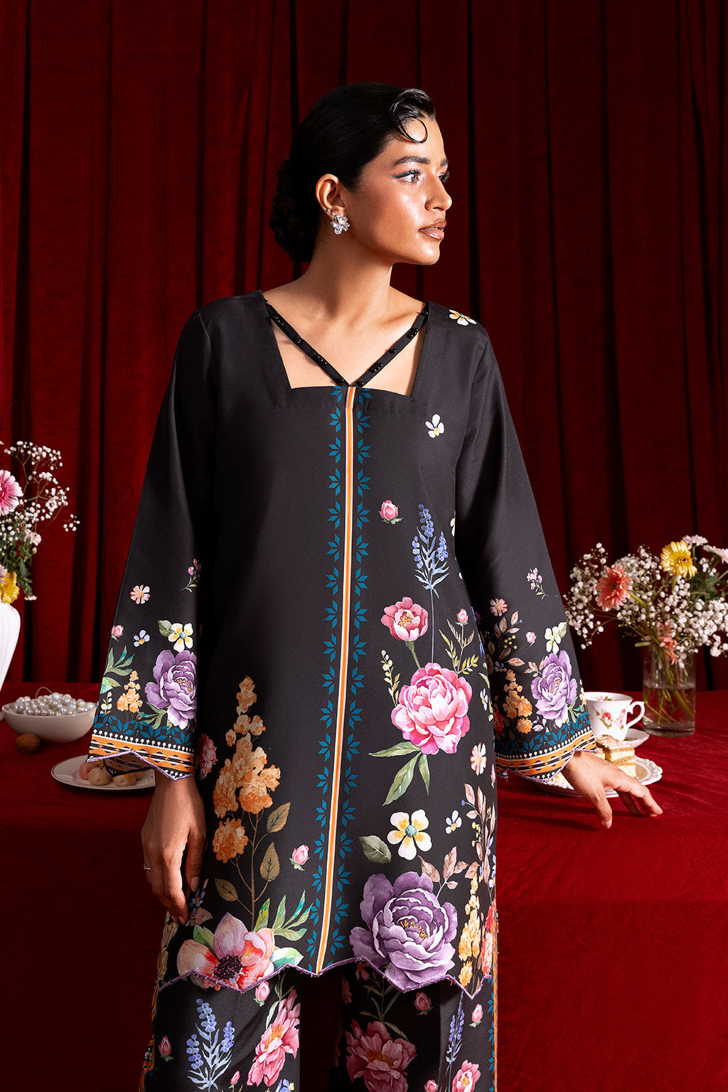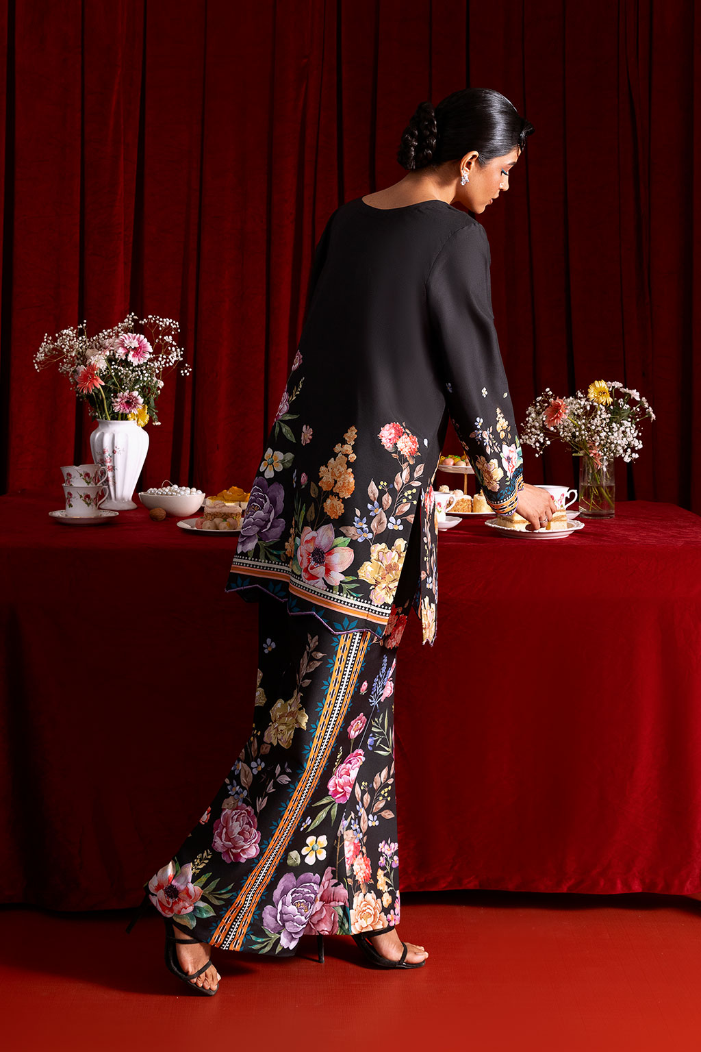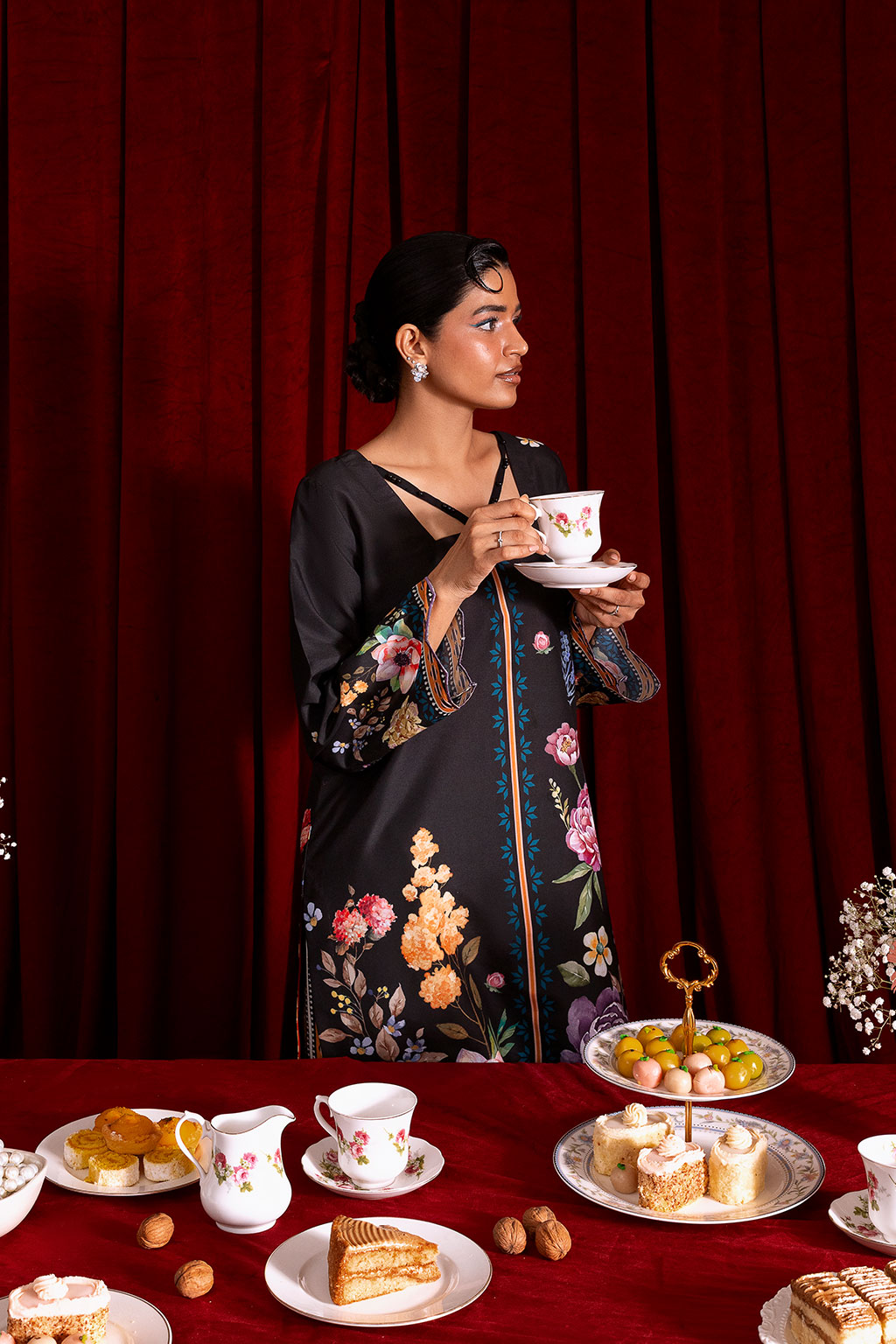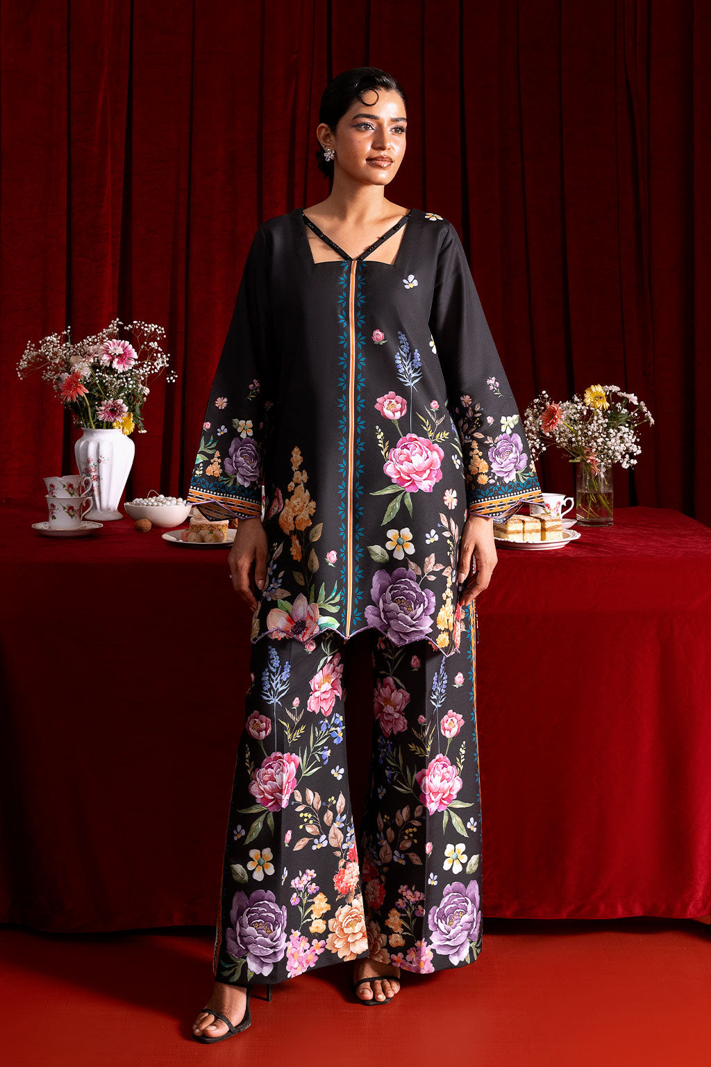 A black Co-ord set adorned with bright floral prints, Features a shirt with neckline and wide-leg trousers, for a breezy silhouette.