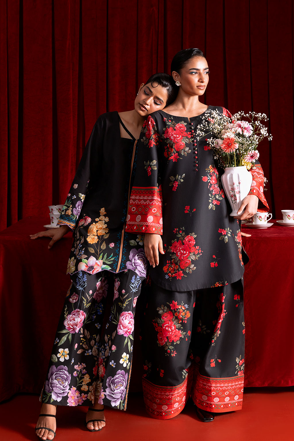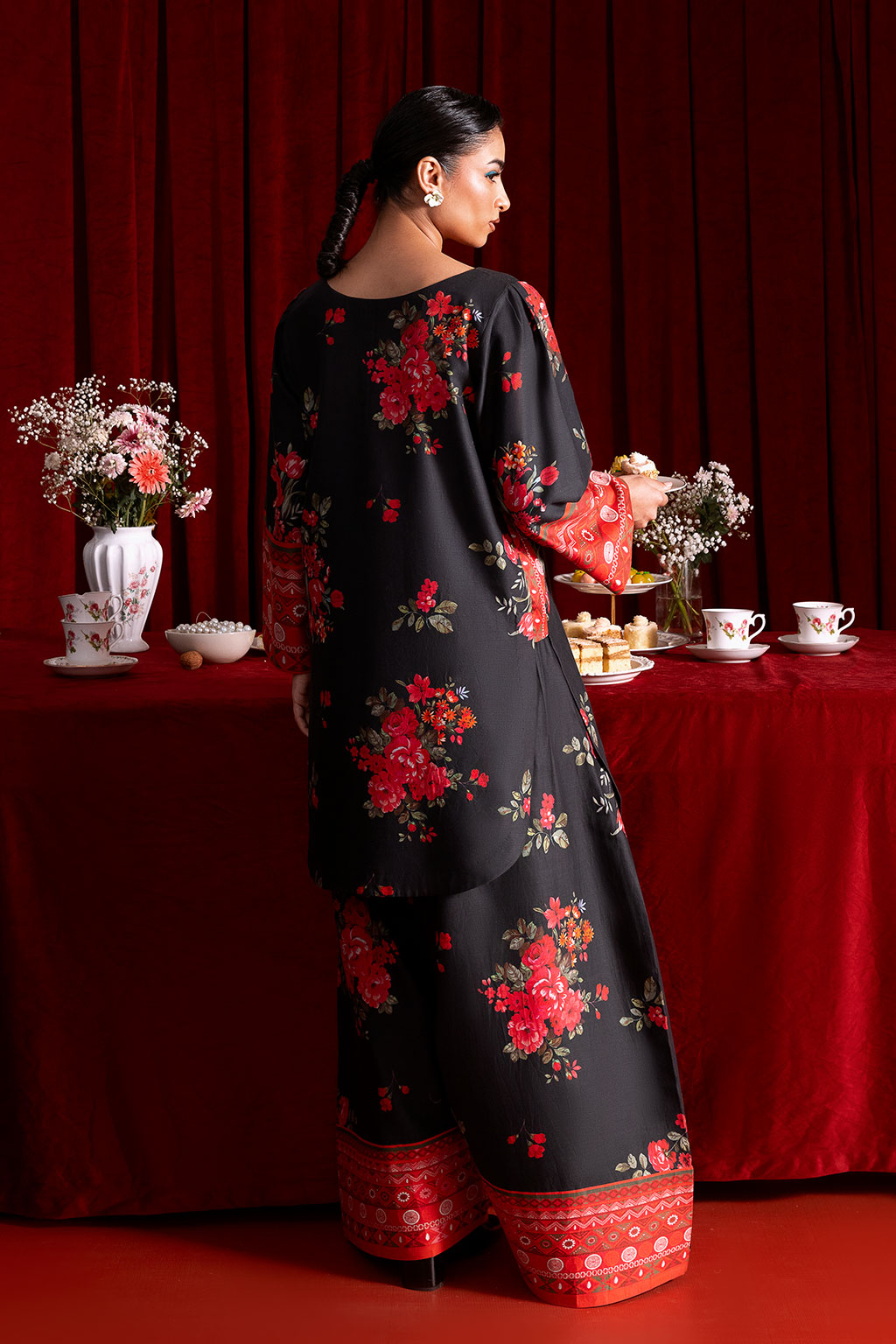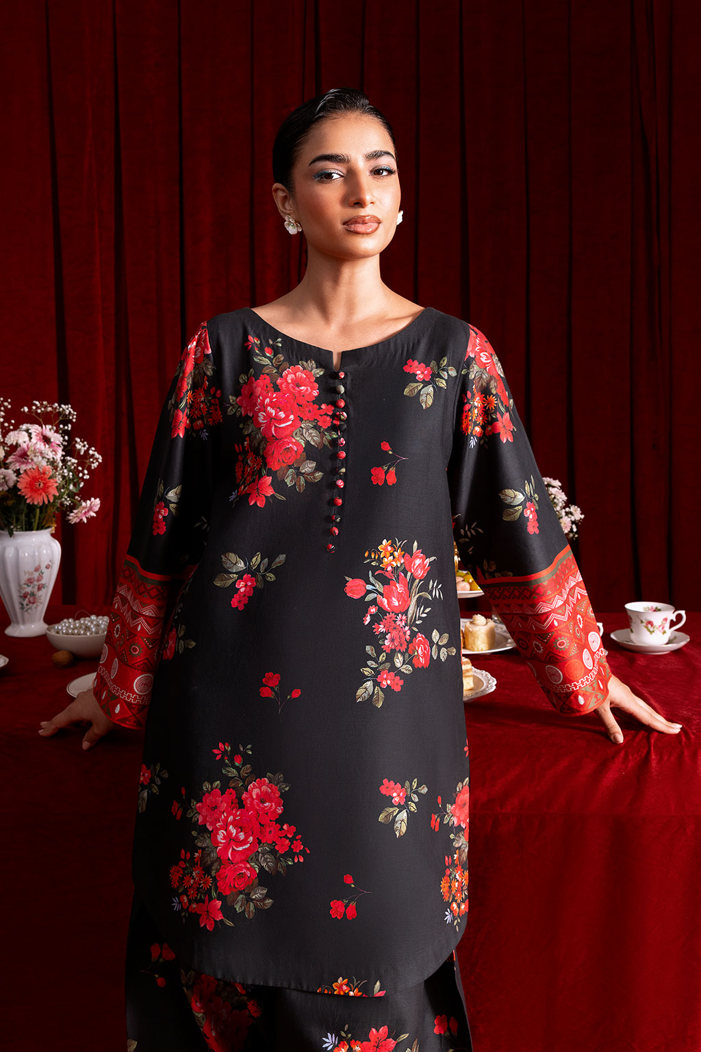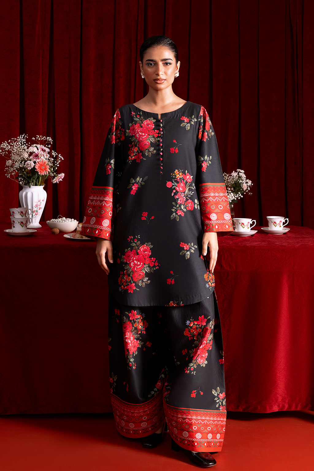 A black Co-ord set adorned with bright floral prints, features a shirt with border on sleeve, The straight-cut short shirt pairs perfectly with farshi shalwar creating a timeless and graceful look for both casual occasions