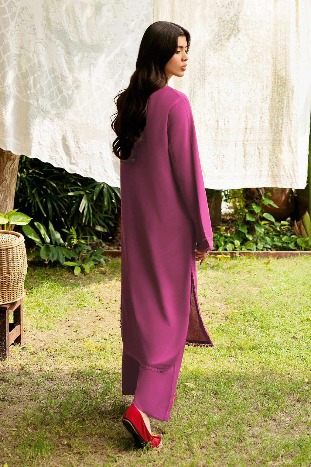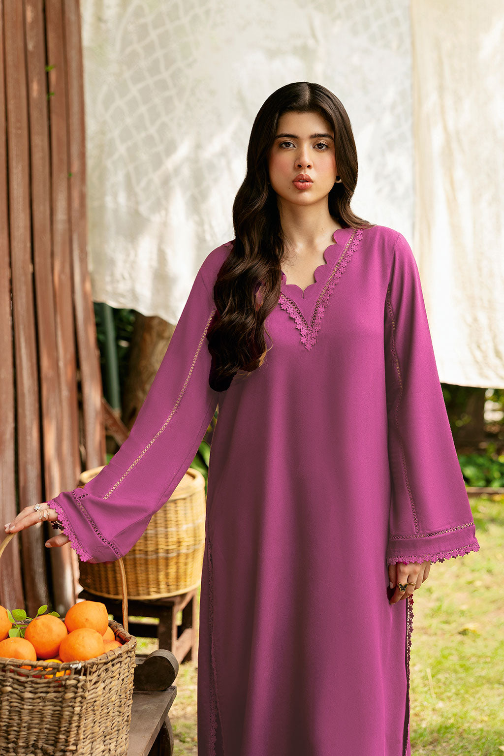 Pink Set includes solid shirt pants with the V neckline embossed scalp with lace - Pure premium karandi with a subtle sheen produced in - house!