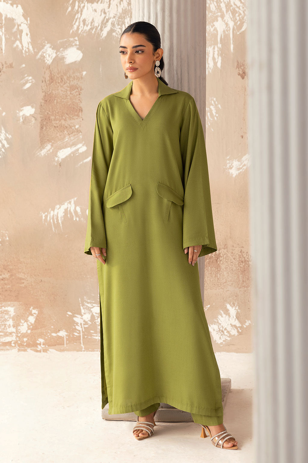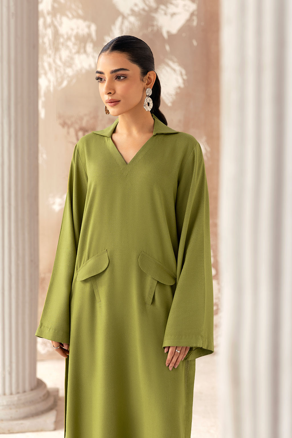 A minimal olive green karandi ensemble featuring a relaxed V-neck collar and statement front pockets. Its fluid silhouette and warm texture make it a refined choice for effortless winter dressing.