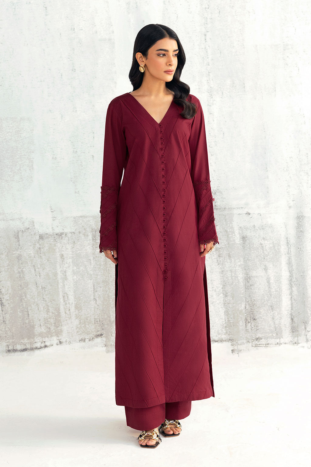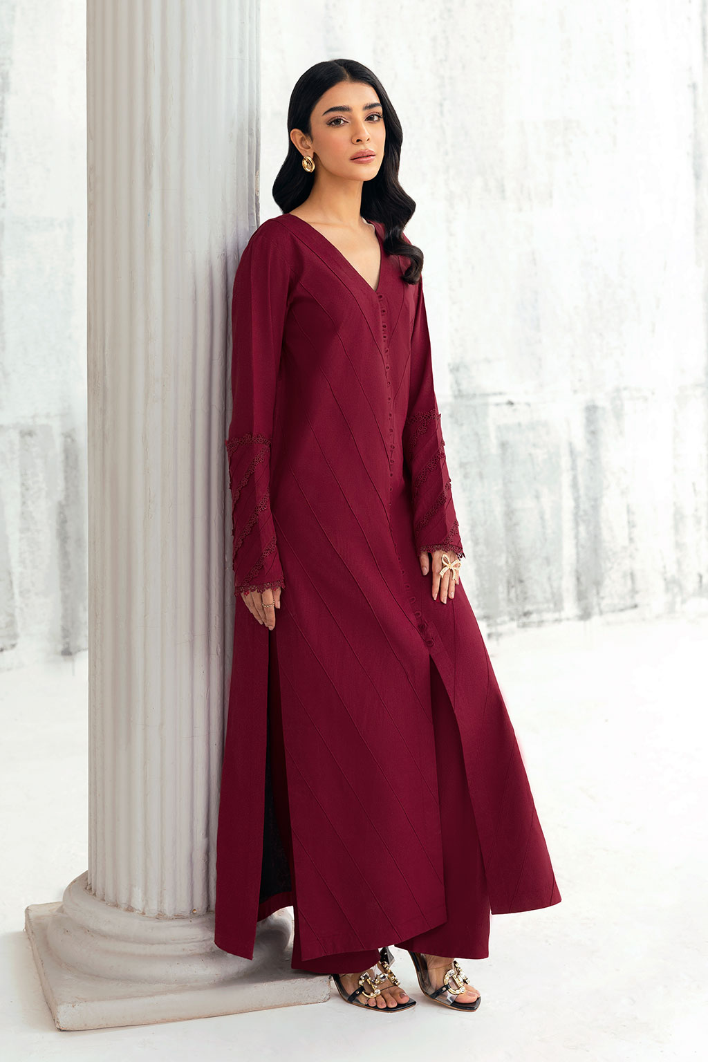 Draped in deep maroon elegance, this winter karandi ensemble blends warmth with sophistication. Its sleek silhouette and intricate sleeve detailing make it a timeless statement for the season.