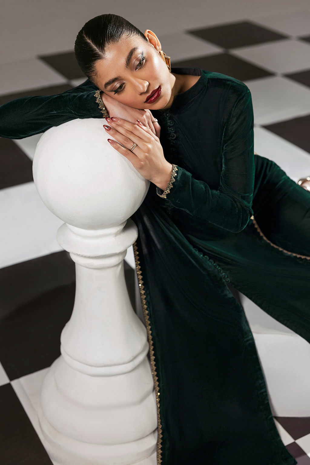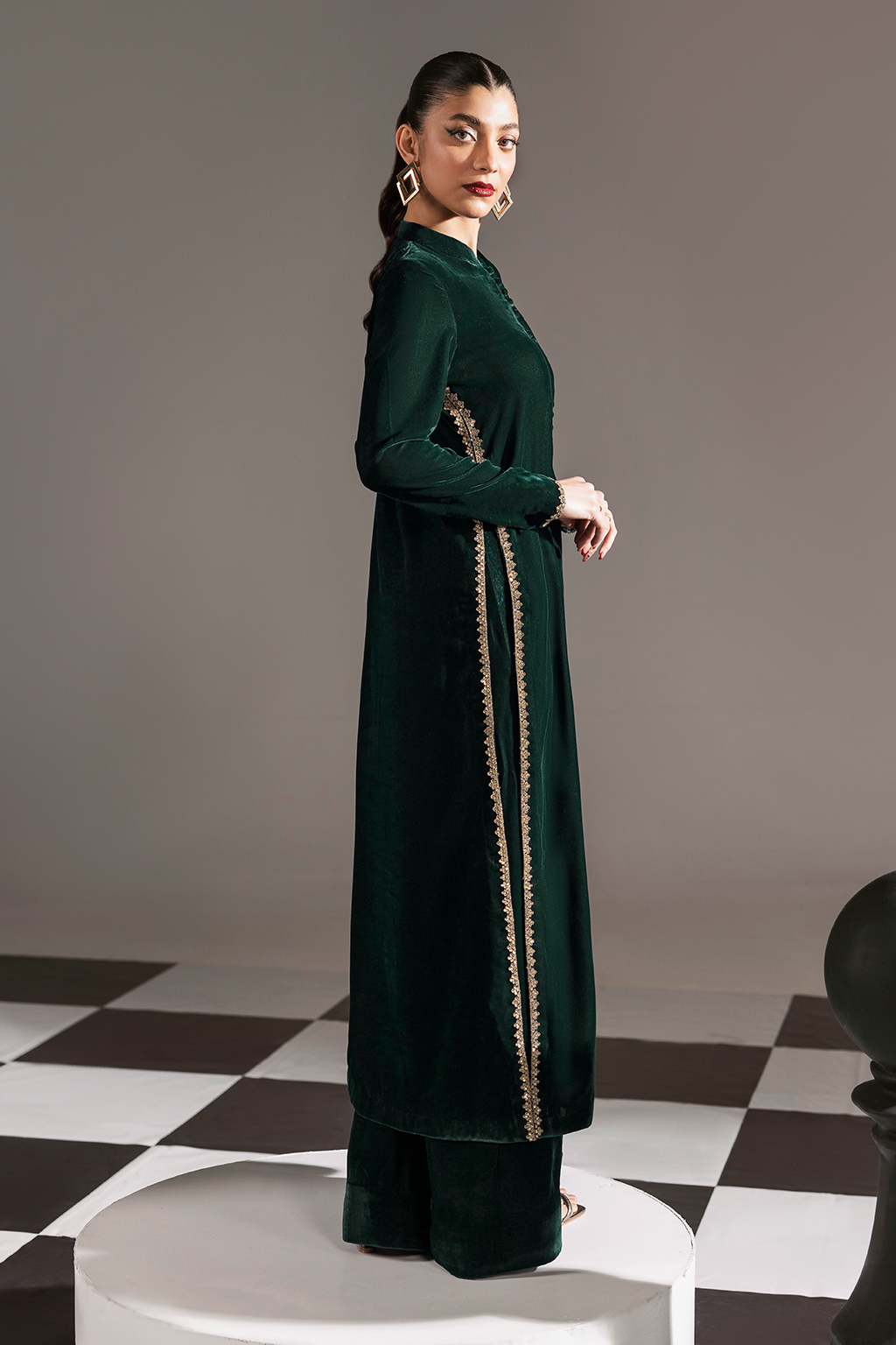 The Royal Green Set Includes a solid shirt and pants with a ban neckline embossed with the loop buttons along with high side slits with lace—pure premium velvet with a subtle sheen
