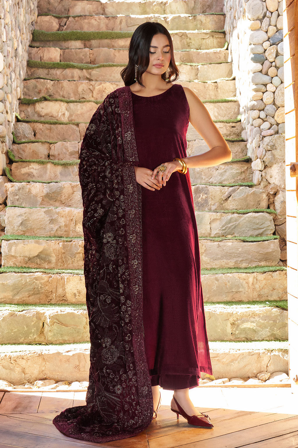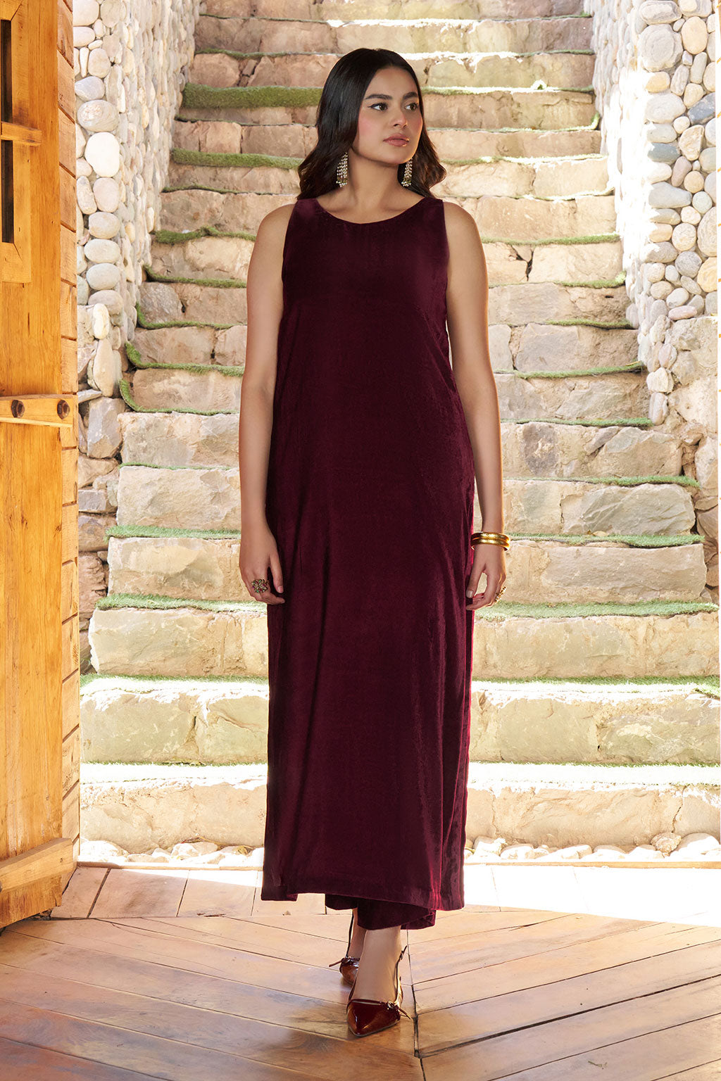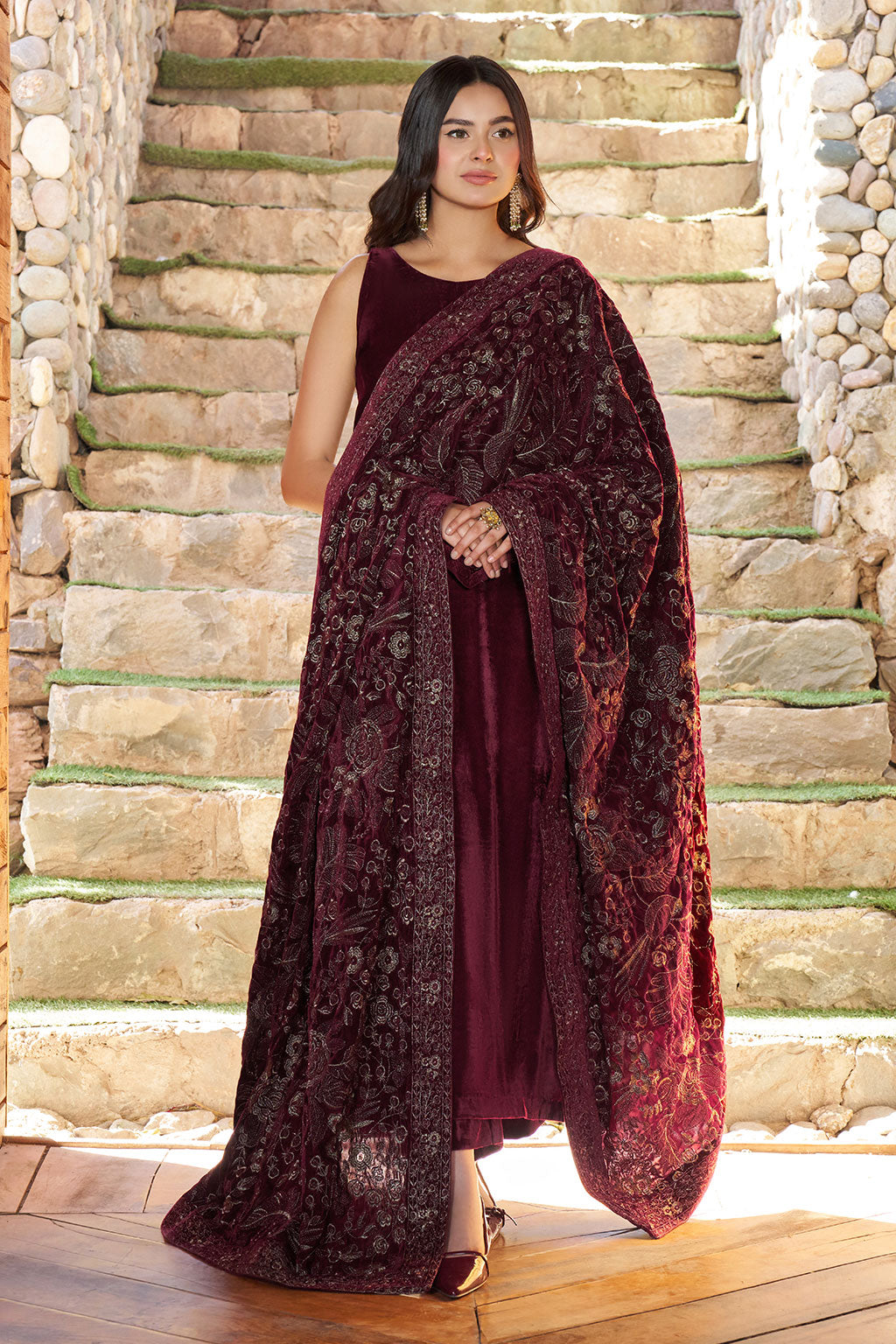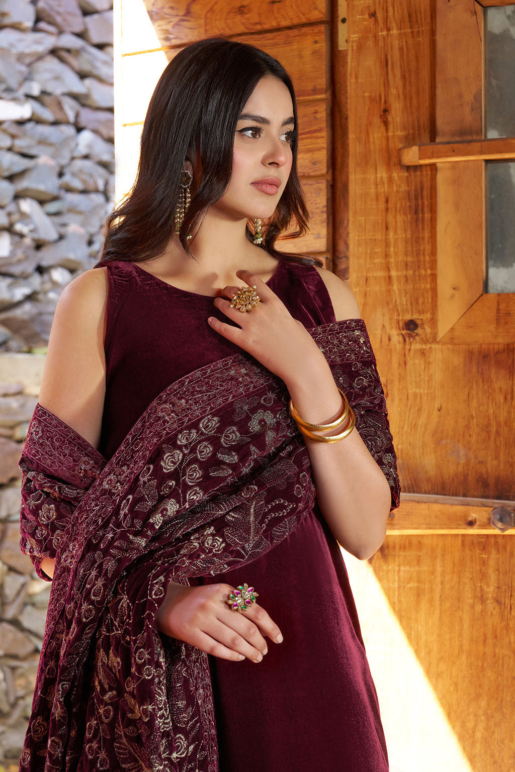Crafted from rich velvet with a sleeveless cut and round neckline, this maroon winter ensemble defines timeless elegance. Paired with a beautifully embroidered shawl, it’s perfect for festive warmth and refined charm.